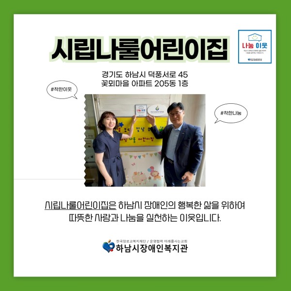 나눔이웃 시립나룰어린이집 페이지 정보 작성자 하남시장애인복지관 작성일25-06-23 16:40 조회수72 본문 시립나룰어린이집은 하남시 장애인의 행복한 삶을 위하여 따뜻한 사랑과 나눔을 실천하는 이웃입니다. 목록 이전글 시립나룰어린이집 25.06.23 다음글 청봉변원 25.06.10