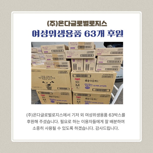 후원내역 온다글로벌로지스 페이지 정보 작성자 하남시장애인복지관 작성일25-04-07 22:13 조회수74 본문 자세히 보기 (주)온다글로벌로지스여성위생용품 63개 후원(주)온다글로벌로지스에서 기저 외 여성위생용품 63박스를후원해 주셨습니다. 필요로 하는 이용자들에게 잘 배분하여소중히 사용될 수 있도록 하겠습니다. 감사드립니다. 목록 이전글 프랭크서울 삼전점 25.04.07 다음글 돌고도네이션 25.04.07