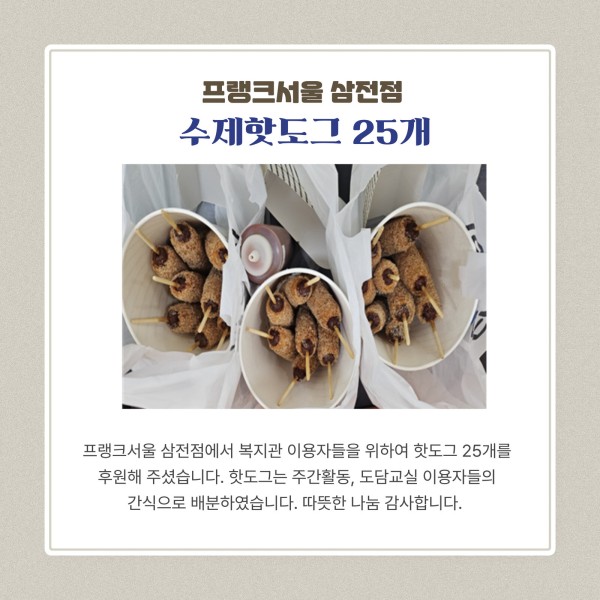 후원내역 프랭크서울 삼전점 페이지 정보 작성자 하남시장애인복지관 작성일25-04-07 22:14 조회수70 본문 자세히 보기 프랭크서울 삼전점수제핫도그 25개프랭크서울 삼전점에서 복지관 이용자들을 위하여 핫도그 25개를후원해 주셨습니다. 핫도그는 주간활동, 도담교실 이용자들의간식으로 배분하였습니다. 따뜻한 나눔 감사합니다. 목록 이전글 한채당베이커리 25.04.07 다음글 온다글로벌로지스 25.04.07