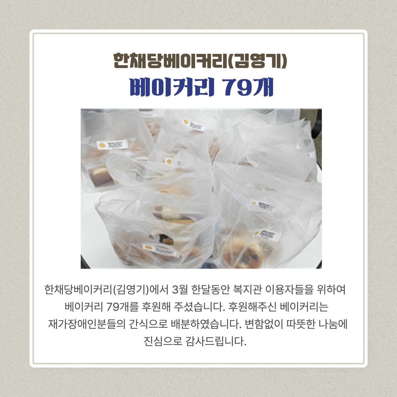 베이커리 79개를 후원해 주셨습니다. 후원해주신 베이커리는