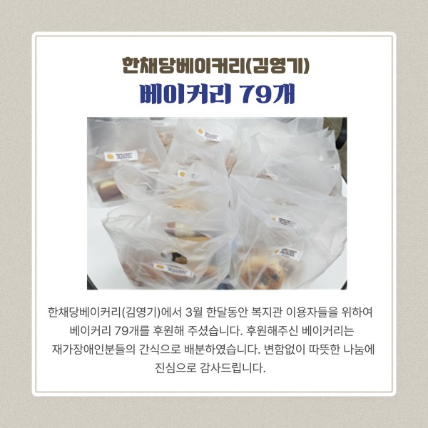 한채당베이커리(김영기)에서 3월 한달동안 복지관 이용자들을 위하여