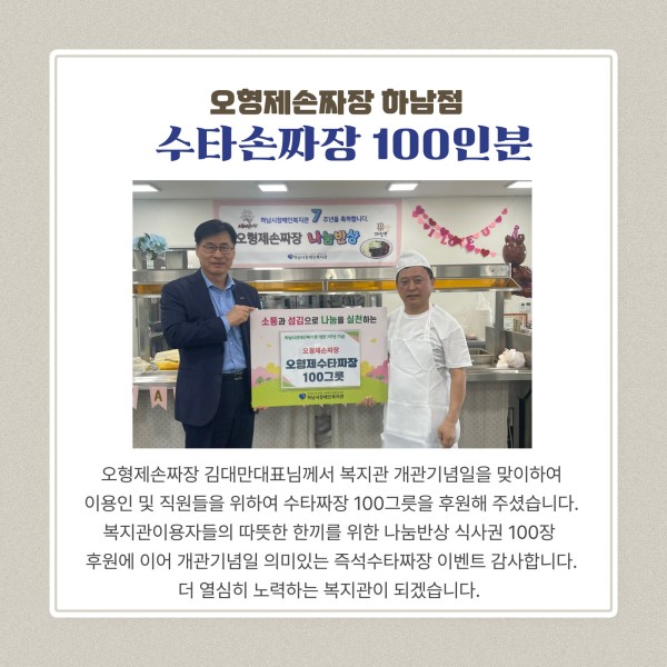 후원내역 오형제손짜장 페이지 정보 작성자 하남시장애인복지관 작성일25-04-07 22:16 조회수89 본문 자세히 보기오형제손짜장 하남점수타손짜장 100인분 오형제손짜장 김대만대표님께서 복지관 개관기념일을 맞이하여이용인 및 직원들을 위하여 수타짜장 100그릇을 후원해 주셨습니다.복지관이용자들의 따뜻한 한끼를 위한 나눔반상 식사권 100장후원에 이어 개관기념일 의미있는 즉석수타짜장 이벤트 감사합니다.더 열심히 노력하는 복지관이 되겠습니다. 목록 이전글 정소희노무사사무소 25.04.07 다음글 백년곰탕 25.04.07