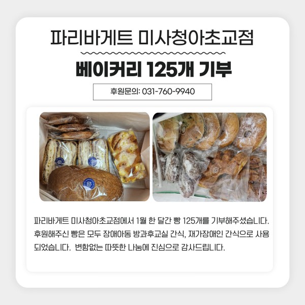 파리바게트 미사청아초교점에서 1월 한 달간 빵 125개를 기부해주셨습니다.
