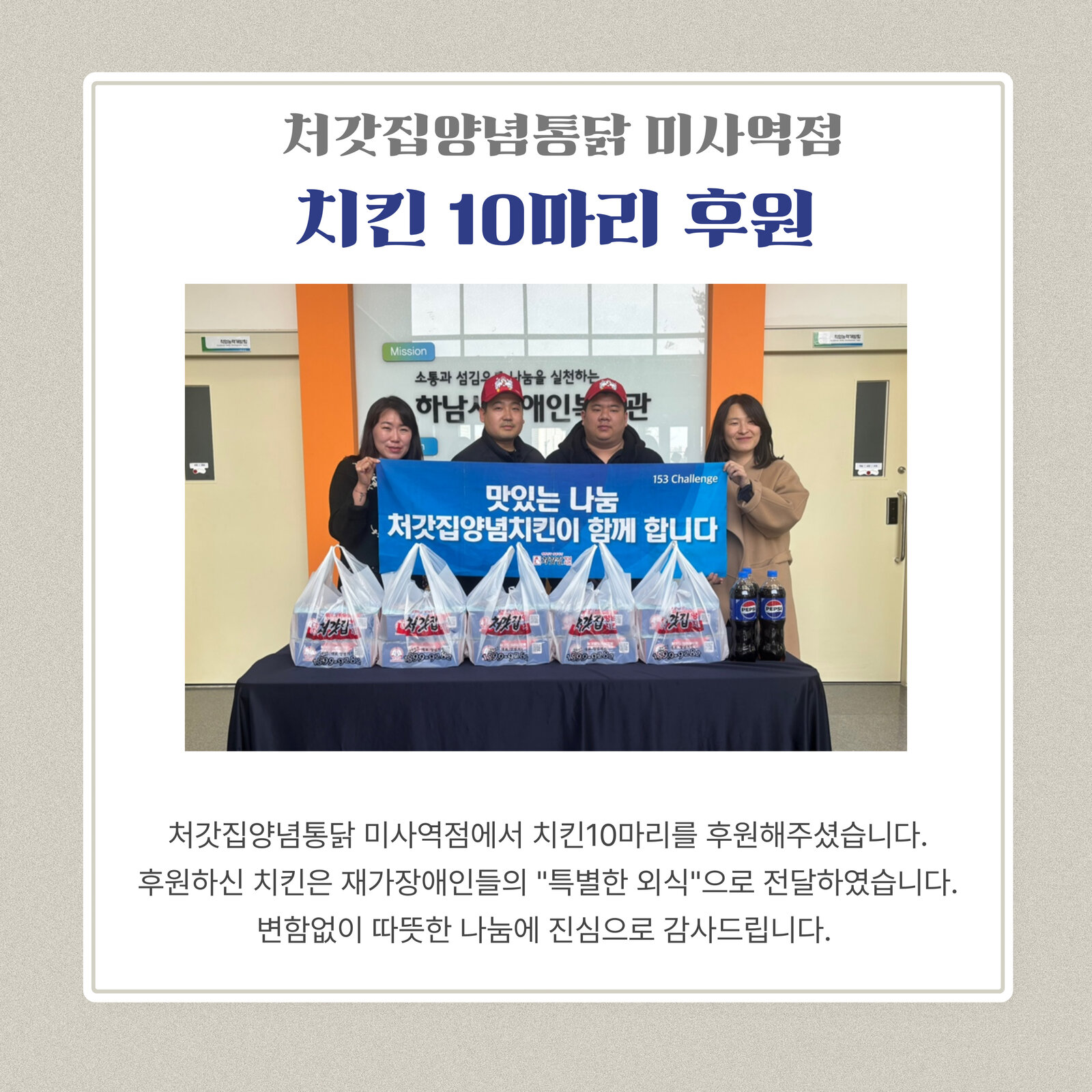 후원내역 처갓집양념치킨 미사역점 페이지 정보 작성자 하남시장애인복지관 작성일25-03-14 16:12 조회수91 본문 자세히 보기처갓집양념통닭 미사역점치킨 10마리 후원 처갓집양념통닭 미사역점에서 치킨10마리를 후원해주셨습니다.후원하신 치킨은 재가장애인들의 "특별한 외식"으로 전달하였습니다.변함없이 따뜻한 나눔에 진심으로 감사드립니다. 목록 이전글 신화종합유통 25.03.14 다음글 웰니스케어 25.03.14