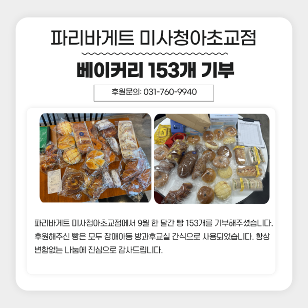 후원내역 파리바게트 미사청아초교점 9월 한 달간 베이커리 153개 기부
