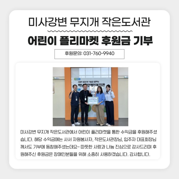 미사강변 무지개 작은도서관에서 어린이 플리마켓을 통한 수익금을 후원해주셨