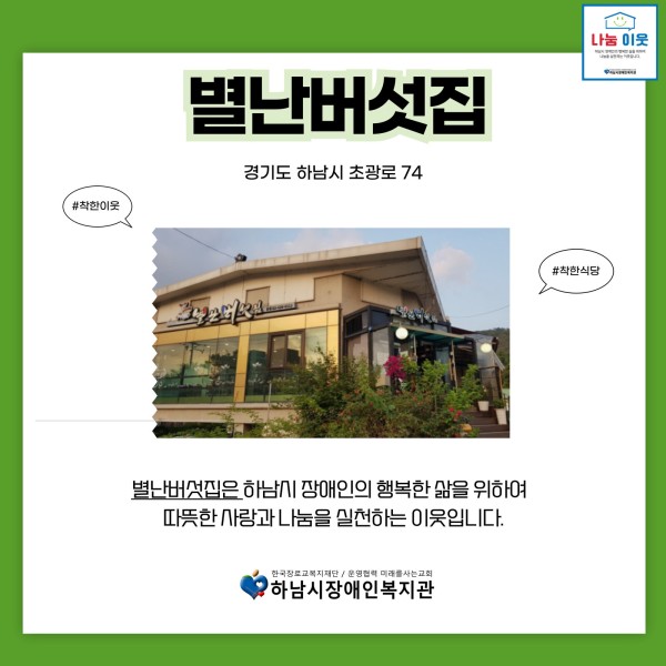 나눔이웃 별난버섯집 페이지 정보 작성자 하남시장애인복지관 작성일24-08-23 17:17 조회수93 본문 별난버섯집경기도 하남시 초광로 74별난버섯집은 하남시 장애인의 행복한 삶을 위하여따뜻한 사랑과 나눔을 실천하는 이웃입니다. 목록 이전글 강변손두부 24.08.23 다음글 연세바른치과의원 24.06.26