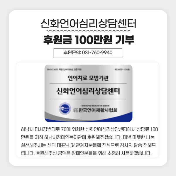 후원내역 신화언어심리상담센터 후원금 100만원 기부