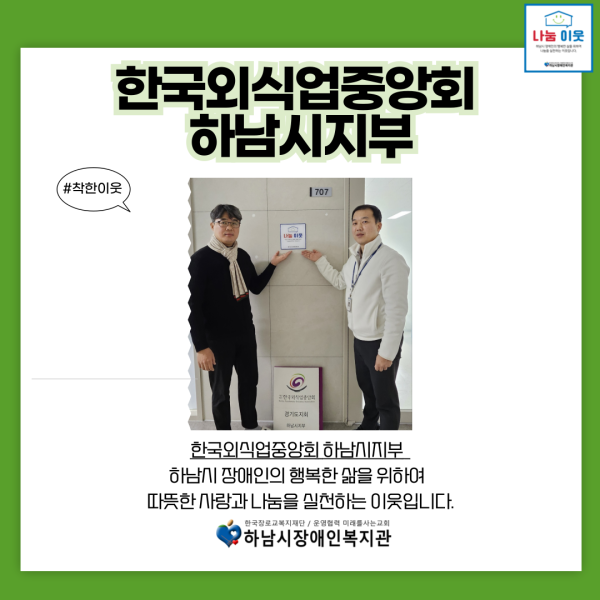 나눔이웃 한국외식중앙회 하남시지부 페이지 정보 작성자 하남시장애인복지관 작성일25-02-07 10:57 조회수124 본문 자세히 보기한국외식업중앙회하남시지부한국외식업중앙회 하남시지부하남시 장애인의 행복한 삶을 위하여따뜻한 사랑과 나눔을 실천하는 이웃입니다. 검색 목록 이전글 (주)대치성공스토리학원 25.02.07 다음글 강변손두부 24.08.23
