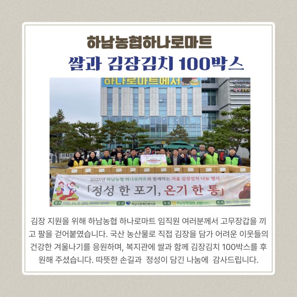 후원내역 하남농협하나로마트 페이지 정보 작성자 하남시장애인복지관 작성일25-12-14 23:59 조회수23 본문 <하남농협하나로마트- 쌀+김장김치 100박스 후원>김장 지원을 위해 하남농협 하나로마트 임직원 여러분께서 고무장갑을 끼고 팔을 걷어붙였습니다. 국산 농산물로 직접 김장을 담가 어려운 이웃들의 건강한 겨울나기를 응원하며, 복지관에 쌀과 함께 김장김치 100박스를 후원해 주셨습니다. 따뜻한 손길과 정성이 담긴 나눔에 감사드립니다. 검색 목록 이전글 동부신협 25.12.15 다음글 삼성E&A 25.12.14