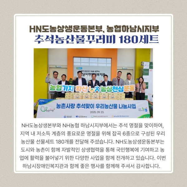 NH도농상생본부와 NH농협 하남시지부에서는 추석 명절을 맞이하여, 지역 내 저소득 계층의 풍요로운 명절을 위해 잡곡 6종으로 구성된 우리농산물 선물세트 180개를 전달해 주셨습니다. NH도농상생운동본부는도시와 농촌이 함께 자발적인 상생협력을 통해 국민행복에 기여하고 농업에 활력을 불어넣기 위한 다양한 사업을 함께 전개하고 있습니다. 이번 하남시장애인복지관과 함께 좋은 행사를 함께해 주셔서 감사합니다.