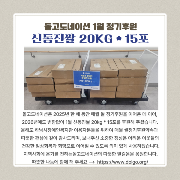 2026년에도 변함없이 1월 신동진쌀 20kg * 15포를 후원해 주셨습니다.