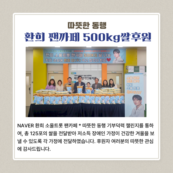 NAVER 환희 소울트롯 팬카페 * 따뜻한 동행 기부덕력 챌린지를 통하여, 총 125포의 쌀을 전달받아 저소득 장애인 가정이 건강한 겨울을 보낼 수 있도록 각 가정에 전달하였습니다. 후원자 여러분의 따뜻한 관심에 감사드립니다.