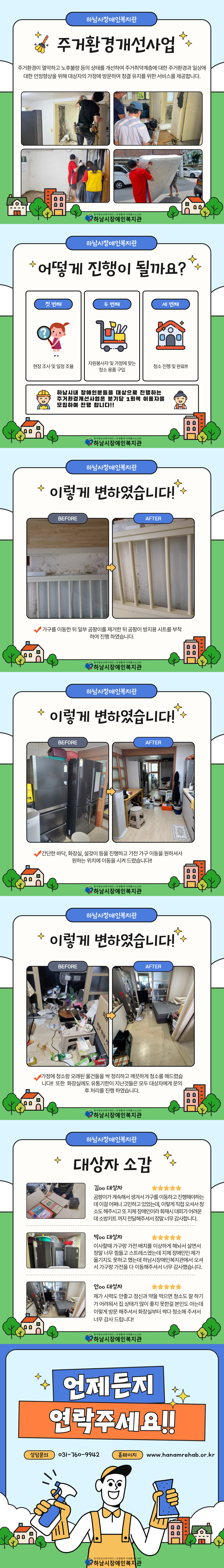 주거환경이 열악하고 노후불량 등의 상태를 개선하여 주거취약계층에 대한 주거환경과 일상에 대한 안정향상을 위해 대상자의 가정에 방문하여 청결 유지를 위한 서비스를 제공합니다.