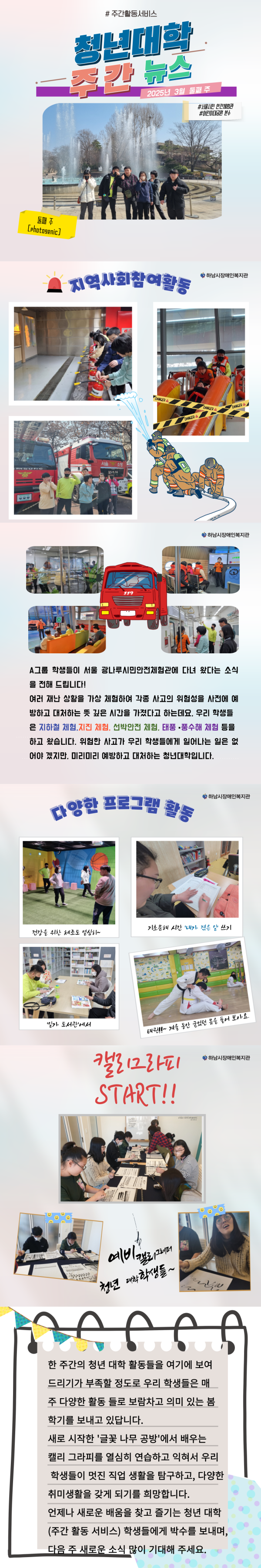 언제나 새로운 배움을 찾고 즐기는 청년 대학(주간 활동 서비스) 학생들에게 박수를 보내며, 다음 주 새로운 소식 많이 기대해 주세요.