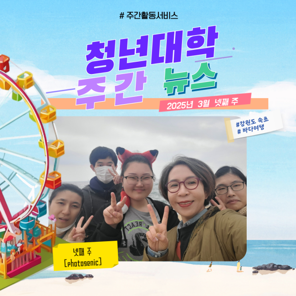 '청년대학 어디까지 가봤니?' 슬로건에 맞게 170 km 거리의 속초까지 멀리 다녀 왔다는 빅 뉴스를 알려 드립니다. 속초 아이 대관람차와 외옹치항 둘레길을 거닐고 왔다고 하는데요. 당일치기 여행이 피곤했을 법도 하지만, 우리 학생들!! 너무 즐거워하고, 다음 날 결석도 없었다니 정말 다행입니다. 동료와 함께한 여행이 가족 여행과는 또 다른 행복한 추억으로 남길 바랍니다.~~
