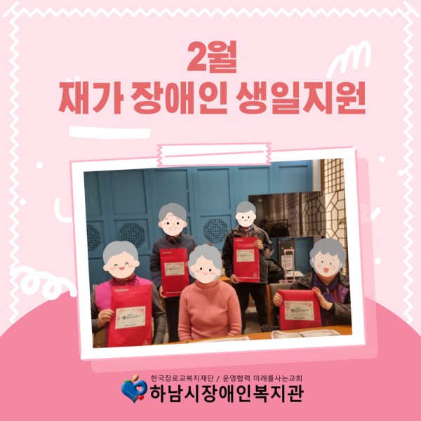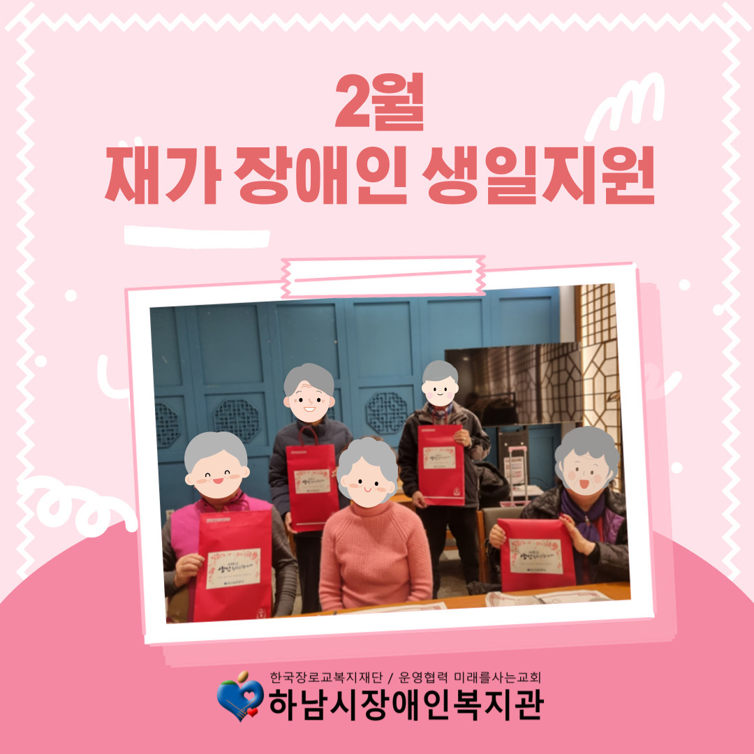 지역사회개발 [지역사회개발] 2월 재가장애인 생일잔치 페이지 정보 작성자 하남시장애인복지관 작성일25-02-24 14:44 조회수149 본문 자세히 보기자세히 보기2월 재가 장애인 생일지원2월 생일잔치!한채당에서 후원해주신 궁중한정식을 맛있게 드셨으며,음식이 나올 때마다 사진도 찍으시고 너무 기뻐하셨습니다.항상 함께하는 나눔이웃들이 있기에 장애인들에게 사랑을 선물할 수 있었습니다.꾸준한 후원 감사드립니다^^부득이 함께하지 못한 분들께는선물을 전달하였습니다.멀리까지 와줘서 고맙다고 말씀하시며감사의 마음도 표현하셨습니다^^어르신, 생신 축하드립니다.더 많은 시간 건강하고 행복하세요! 사랑합니다! 목록 이전글 [지역사회개발] 2025년 권익옹호알리미 1차시 "장애인학대" 25.02.25 다음글 [직업능력개발팀] 25년 2월 훈련생 외부활동 ~ ♬ 25.02.21