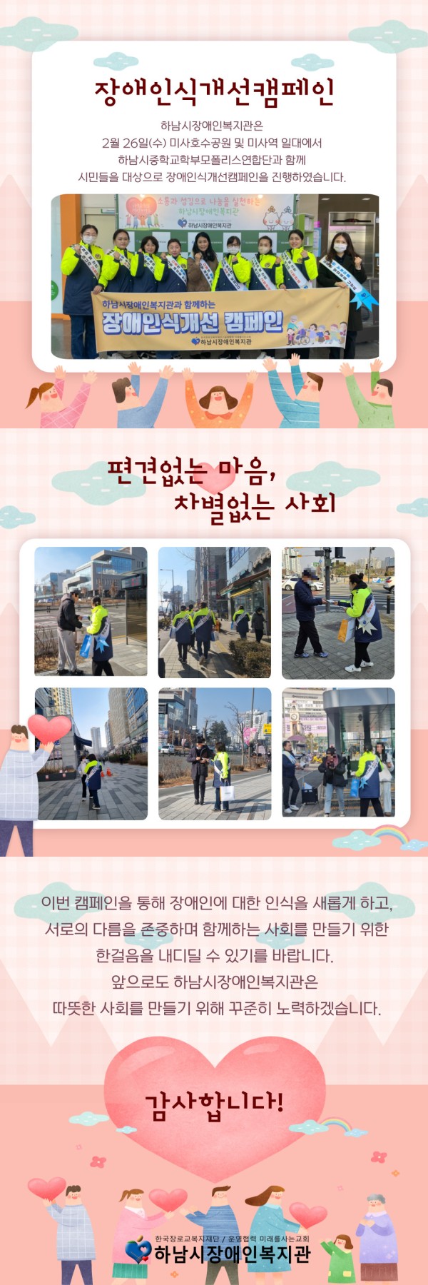 지역사회개발 [지역사회개발]하남시중학교폴리스연합단과 함께 장애인식개선 캠페인 진행 페이지 정보 작성자 하남시장애인복지관 작성일25-02-26 15:20 조회수163 본문 자세히 보기자세히 보기장애인식개선캠페인하남시장애인복지관은 2월26일(수) 미사호수공원 및 미사역 일대에서하남시중학교학부모폴리스연합단과 함께 시민들을 대상으로 장애인식개선캠페인을 진행하였습니다.이번 캠페인을 통해 장애인에 대한 인식을 새롭게 하고,서로의 다름을 존중하며 함께하는 사회를 만들기 위한 한걸음을 내디딜 수 있기를 바랍니다.앞으로도 하남시 장애인 복지관은 따뜻한 사회를 만들기 위해 꾸준히 노력하겠습니다. 감사합니다. 목록 이전글 [주간보호] 현장학습(인천 월미도) 프로그램 25.02.27 다음글 [지역사회개발] 2025년 권익옹호알리미 1차시 "장애인학대" 25.02.25