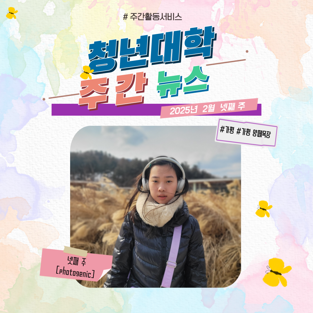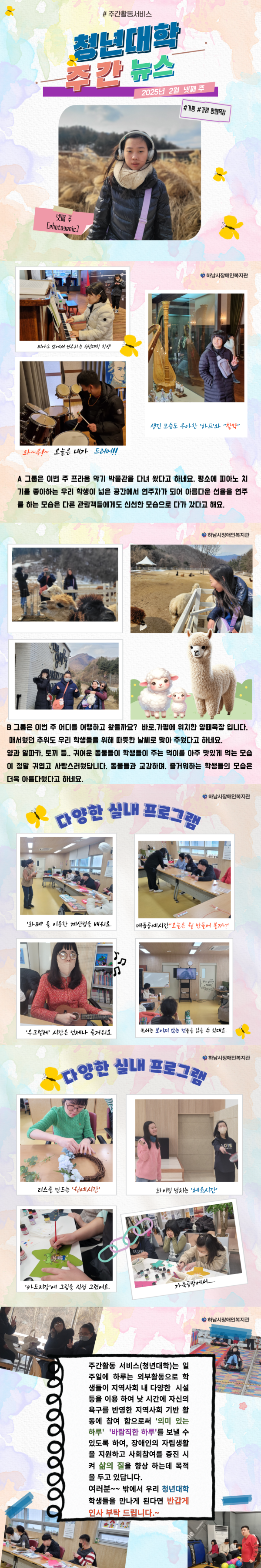 주관 활동서비스(청년 대학)는 일주일에 하루는 외부활동으로 학생들이 지역사회 내 다양한 시설 등을 이용하여 낮 시간에 자신의 욕구를 반영하는 지역사회 기반 활동에 참여함으로써 ‘의미 있는 하루’ ‘바람직한 하루’를 보낼 수 있도록 하여, 장애인의 자립생활을 지원하고 사회참여를 증진 시켜 삶의 질을 향상하는 데 목적을 두고 있습니다. 여러분~~밖에서 우리 청년대학 학생들을 만나게 된다면 반갑게 인사 부탁드립니다.~