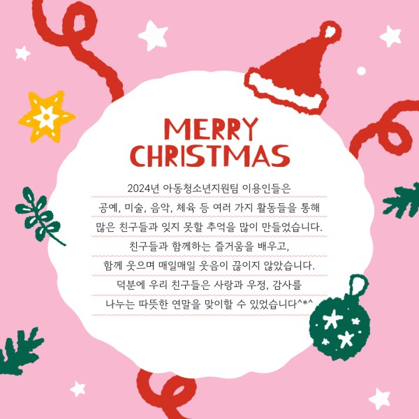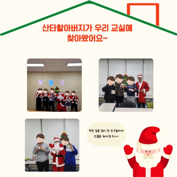 아동청소년 도담교실 & 청소년방과후서비스 크리스마스 파티 ~ 페이지 정보 작성자 하남시장애인복지관 작성일24-12-26 18:36 조회수242 본문 자세히 보기자세히 보기자세히 보기자세히 보기자세히 보기도담교실&청소년방과후크리스마스산타 할아버지를 기다려요~ 산타 할아버지를 기다리며 멋진 트리를 만들어보아요!산타 할아버지가 우리 교실에 찾아왔어요~MERRYCHRISTMAS2024년 아동청소년지원팀 이용인들은공예, 미술, 음악, 체육 등 여러 가지 활동들을 통해많은 친구들과 잊지 못할 추억을 많이 만들었습니다.친구들과 함께하는 즐거움을 배우고,함께 웃으며 매일매일 웃음이 끊이지 않았습니다.덕분에 우리 친구들은 사랑과 우정, 감사를나누는 따뜻한 연말을 맞이할 수 있었습니다^*^ 목록 이전글 [주간보호] 체육대회를 진행했습니다~! 24.12.27 다음글 [직업능력개발]I got everything 미사도서관점 유투브 촬영 및 아메리카노 반값행사 24.12.24