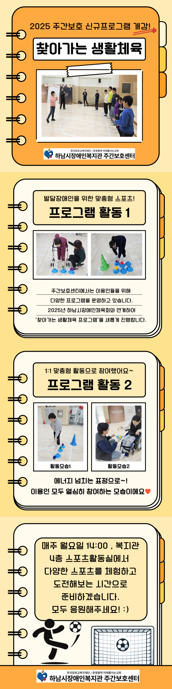 주간이용센터 [주간보호] 2025년 찾아가는 생활체육 프로그램 신규 개강! 페이지 정보 작성자 하남시장애인복지관 작성일25-02-05 19:37 조회수236 본문 자세히 보기자세히 보기2025년 주간보호센터 '찾아가는 생활 체육' 신규 프로그램 개강!주간보호센터에서는 이용인들을 위해 다양한 프로그램을 운영하고 있습니다.2025년 하남시장애인체육회와 연계하여 '찾아가는 생활 체육' 프로그램을 새롭게 진행합니다.이용인들을 위한 1:1 맞춤형 체육 활동으로 매주 월요일 14:00, 복지관 4층 스포츠활동실에서 진행되며,다양한 스포츠를 체험하고 도전해보는 시간으로 준비하겠습니다.모두 응원해주세요! :) 목록 이전글 청년대학 주간뉴스 25.02.10 다음글 [주간보호] 절기행사 진행 25.01.31