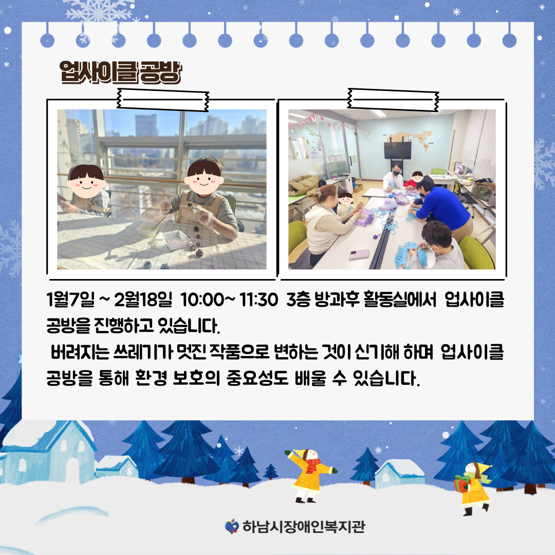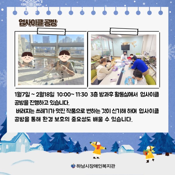 1월 7일부터 2월 18일까지 10:00~11:30에 3층 방과후활동실에서 업사이클 공방을 진행하고 있습니다.