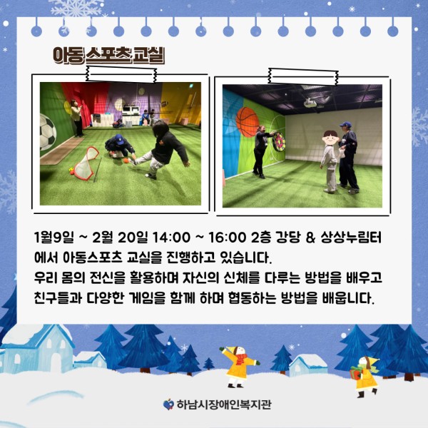 1월 9일부터 2월 20일까지 14:00~16:00까지 2층 강당과 상상누림터에서 아동스포츠교실을 진행하고 있습니다!