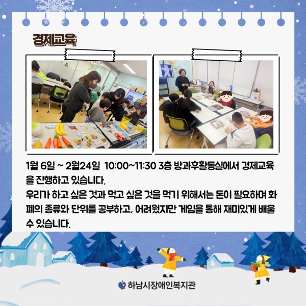 1월 6일부터 2월 24일 10:00~11:30에는 3층 방과후활동실에서 경제교육을 진행하고 있습니다.