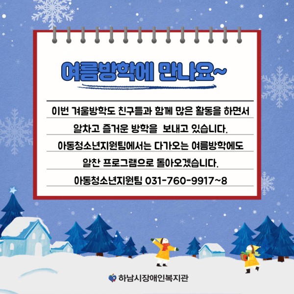 아동청소년지원팀에서는 다가오는 여름방학에도 알찬 프로그램으로 돌아오겠습니다!