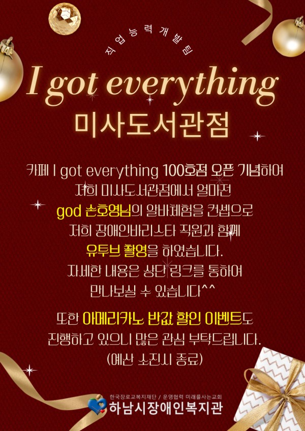 #하남시장애인복지관 #IgotEverything #미사도서관점 #장애인바리스타 #손호영 #유튜브촬영 #카페이벤트 #반값아메리카노 #장애인일자리 #함께하는커피