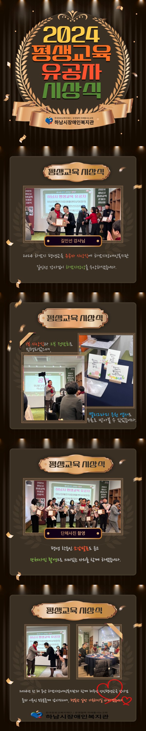 1. 2024 하남시 평생교육 유공자 시상식에 하남시장애인복지관 길인선 강사님이 하남시장상을 수상하셨습니다.