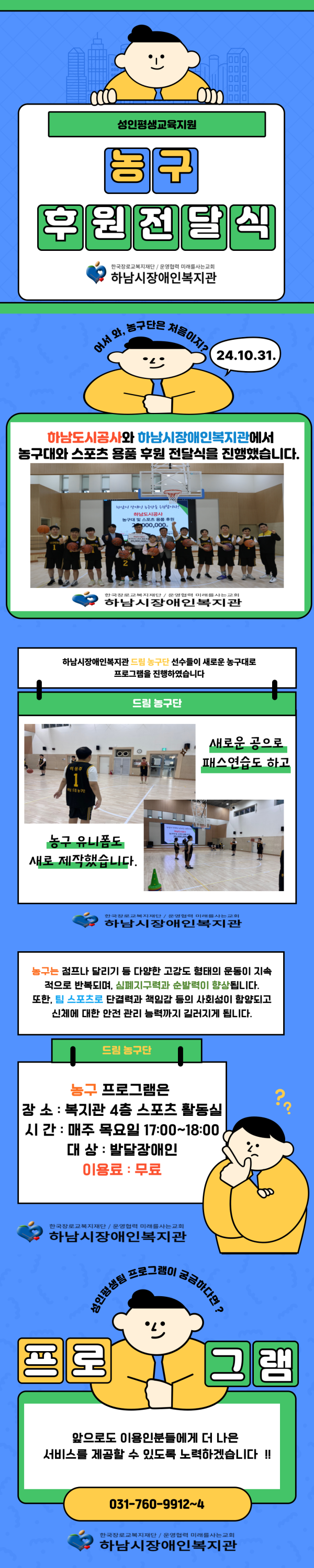 1) 24. 10. 31. 하남도시공사와 하남시장애인복지관에서 농구대와 스포츠 용품 후원 전달식을 진행했습니다