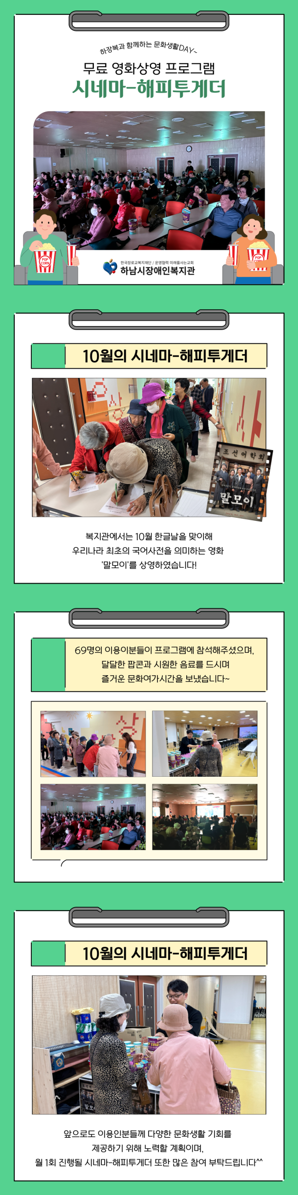 앞으로도 이용인분들께 다양한 문화생활 기회를 제공하기 위해 노력할 계획이며, 월1회 진행될 시네마-해피투게더 또한 많은 참여부탁드립ㄴ다^^