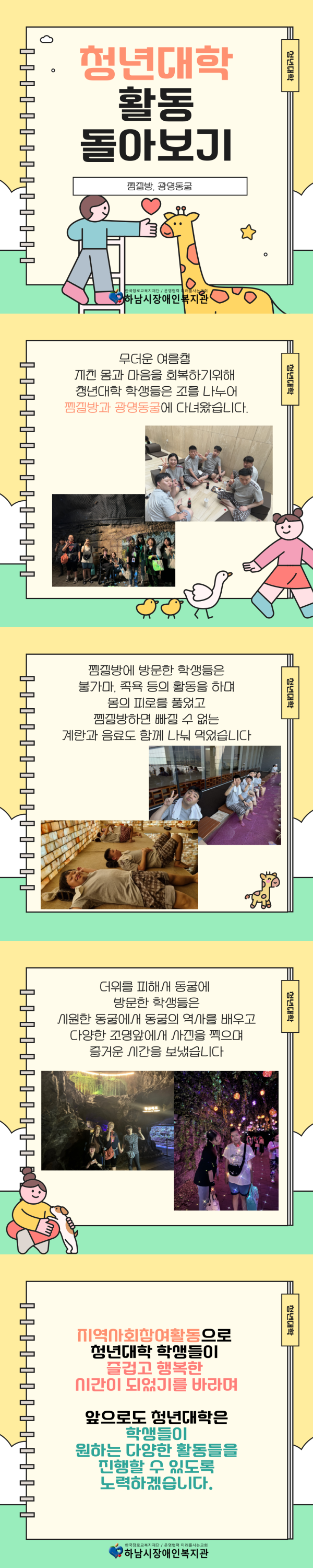 2) 무더운 여름철 지친 몸과 마음을 회복하기 위해 청년대학 학생들은 조를 나누어 찜질방과 광명동굴에 다녀왔습니다.