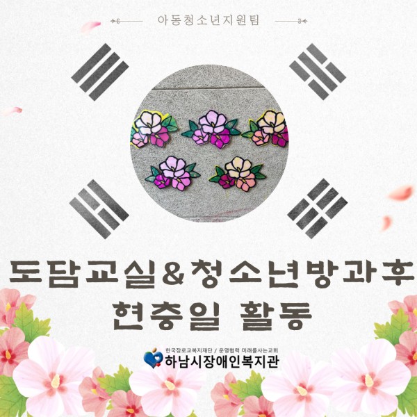 도담교실과 청소년방과후에서는 현충일을 맞이해 한자 무궁화&보석십자수 만들기 특별활동을 진행했습니다~