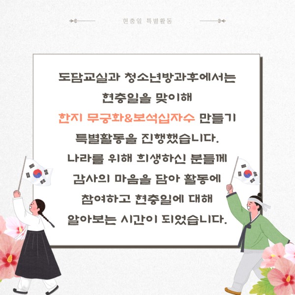 나라를 위해 희생하신 분들께 감사의 마음을 담아 활동에 참여하고 현충일에 대해 알아보는 시간이 되었습니다!
