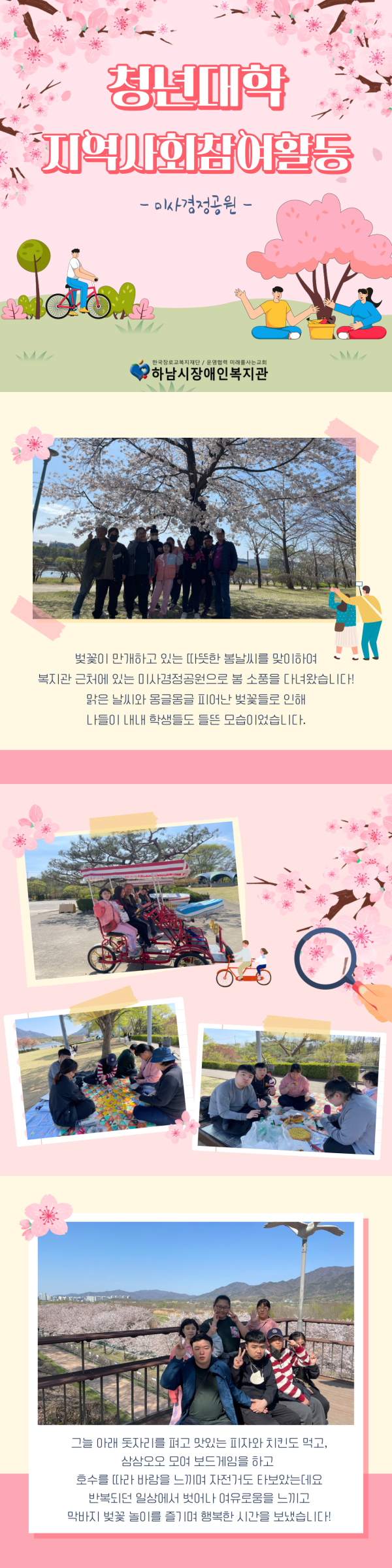 2) 벚꽃이 만개하고 있는 따뜻한 봄날씨를 맞이하여 복지관 근처에 있는 미사경정공원으로 봄 소풍을 다녀왔습니다!