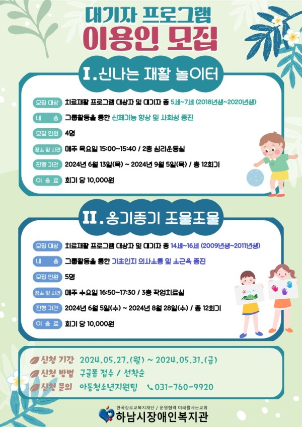 2024년 2차 대기자프로그램(신나는 재활 놀이터, 옹기종기 조물조물) 모집합니다.