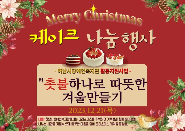 내용: 하남시장애인복지관에서는 크리스마스를 추억하며 가족들과 함께 즐거움을 나누는 시간을 가질 수 있게 따뜻한 마음을 담아 크리스마스 케익을 증정함.