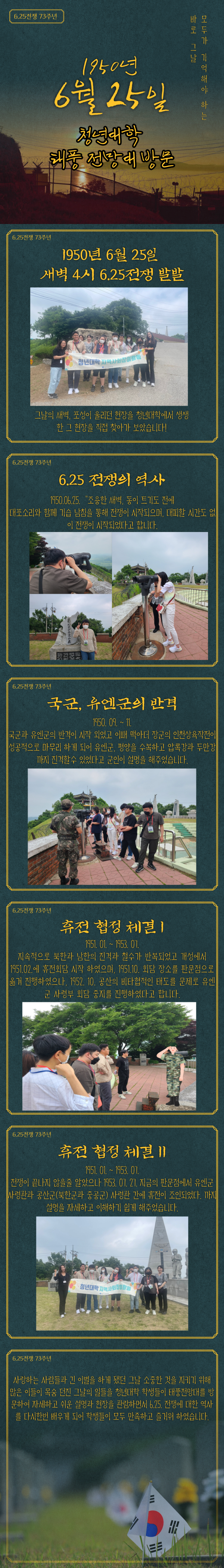 사랑하는 사람들과 긴 이별을 하게 됐던 그날 소중한 것을 지키기 위해 많은 이들이 목숨 던진 그날의 일들을 청년대학 학생들이 태풍전망대를 방문하여 자세하고 쉬운 설명과 현장을 관함하면서 6.25 전쟁에 대한 역사를 다시한번 배우게 되어 학생들이 모두 만족하고 즐거워 하였습니다.