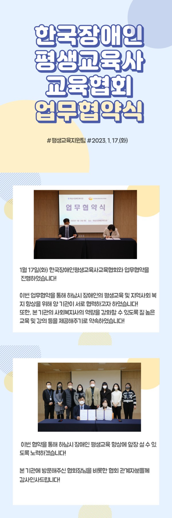 이번 협약을 통해 하남시 장애인 평생교육 향상에 앞장 설 수 있도록 노력하겠습니다!