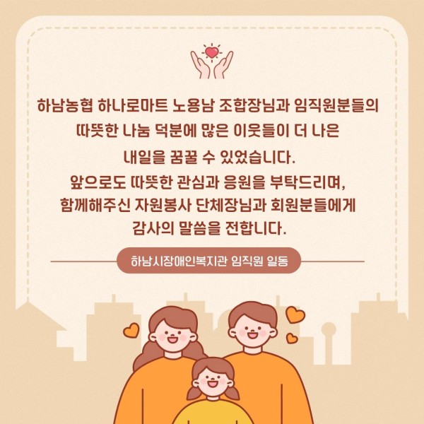 하남농협 하나로마트 노용남 조합장님과 임직원분들의 따뜻한 나눔 덕분에 많이 이웃들이 더 나은 내일을 꿈꿀 수 있었습니다.