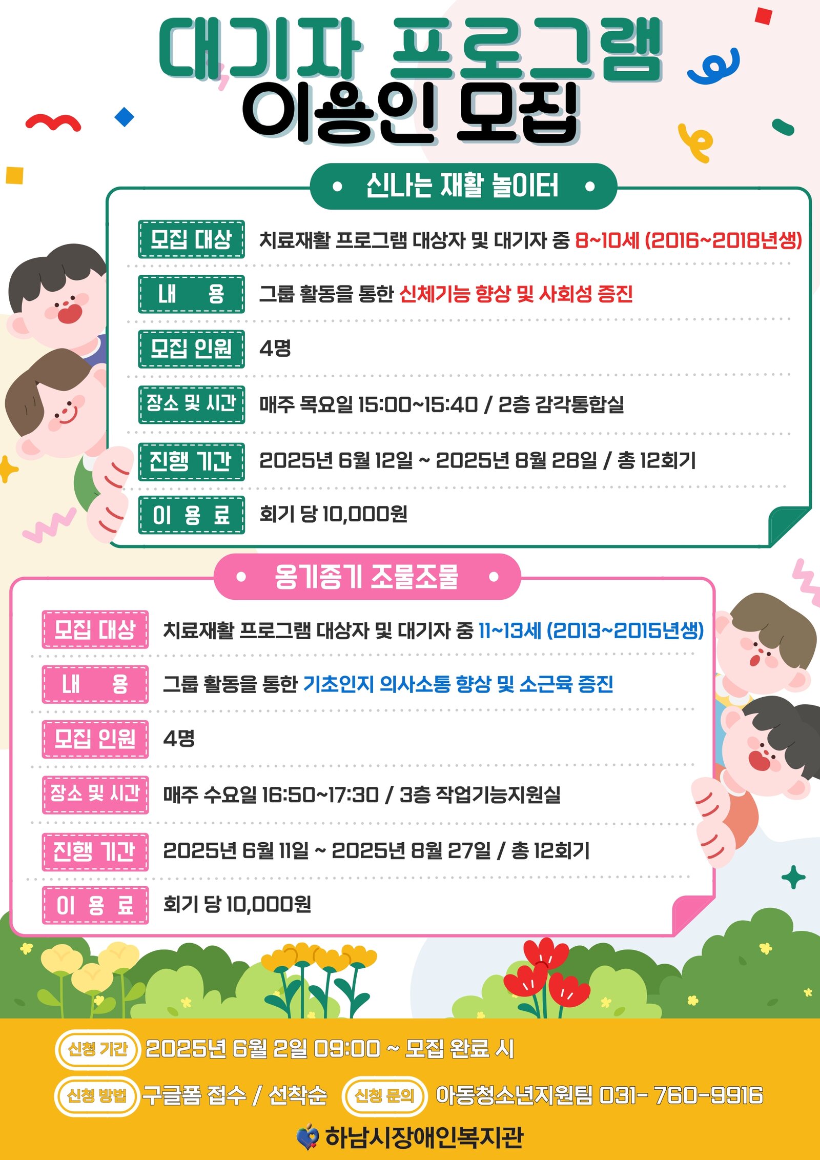 2025년 2차 대기자프로그램(신나는 재활 놀이터, 옹기종기 조물조물) 모집합니다.