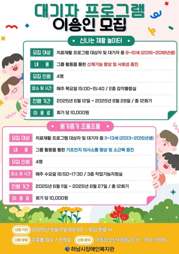 아동청소년 2025년 2차 대기자프로그램(신나는 재활 놀이터, 옹기종기 조물조물) 모집