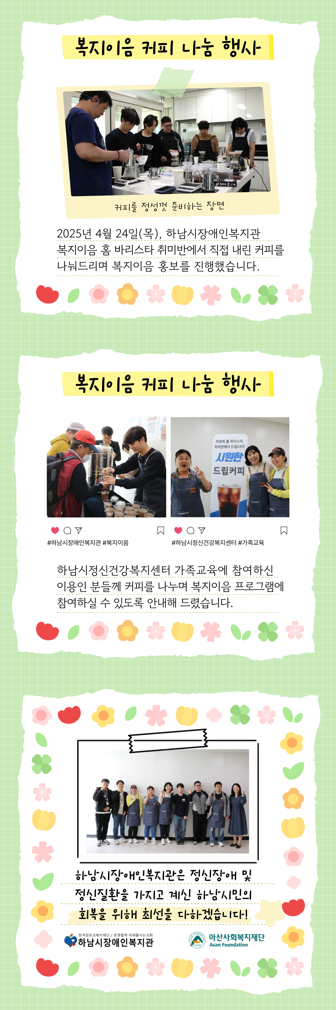 2025년 4월 24일(목), 하남시장애인복지관 복지이음 홈 바리스타 취미반에서 직접 내린 커피를 나눠드리며 복지이음 홍보를 진행했습니다.
