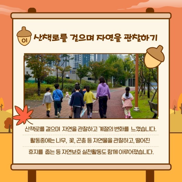 활동중에는 나무, 꽃, 곤충등 자연물을 관찰하고, 떨어진 휴지를 줍는 등 자연보호 실천활동도 함께 이루어졌습니다.