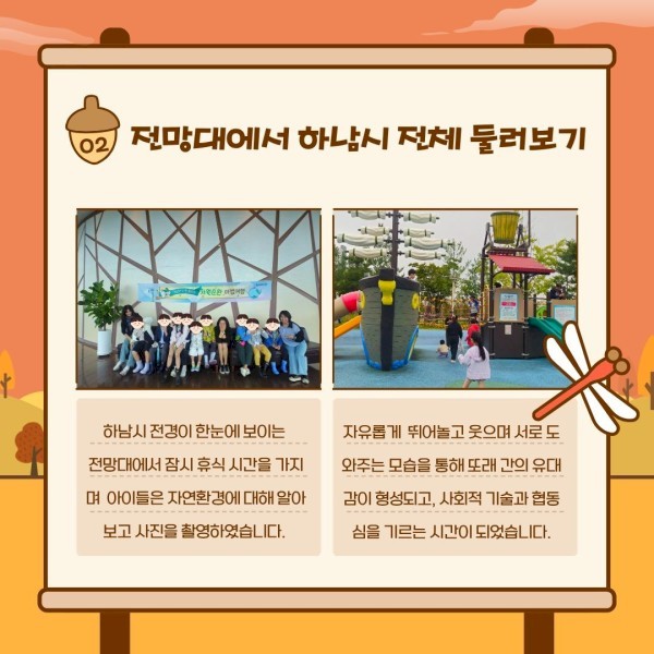 환경을 지키는 마음을 배울 수 있었습니다. 전망대에서 하남시 전경을 바라보며 함께 휴식을 취하고