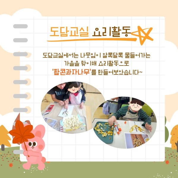 도담교실에서는 나뭇잎이 알록달록 물들어가는 가을을 맞이해 요리활동으로 ‘팝콘과자나무’를 만들어보았습니다.