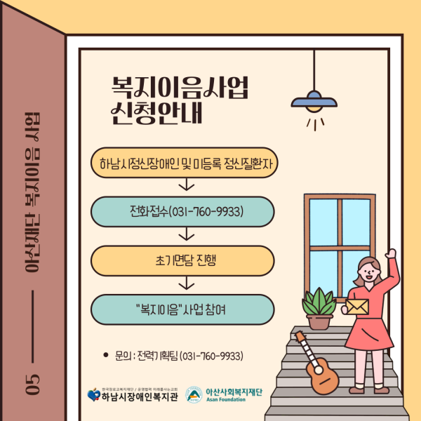 아산재단 "복지이음"사업은 지역사회 내 정신장애인 및 미등록 정신질환자를 대상으로 진행이 되는 사업입니다.