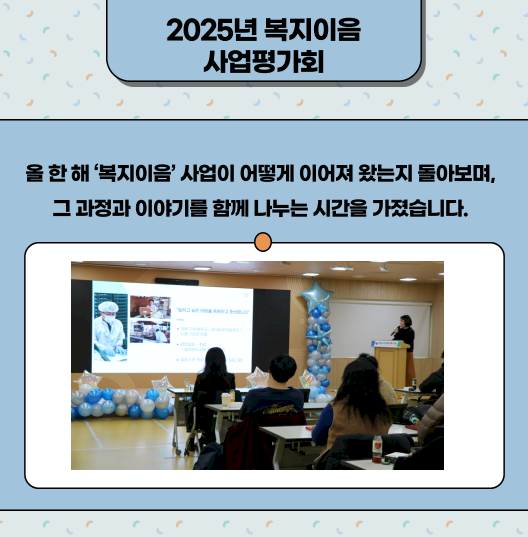 올 한해 ‘복지이음’ 사업이 어떻게 이어져 왔는지 돌아보며, 그 과정과 이야기를 함께 나누는 시간을 가졌습니다.